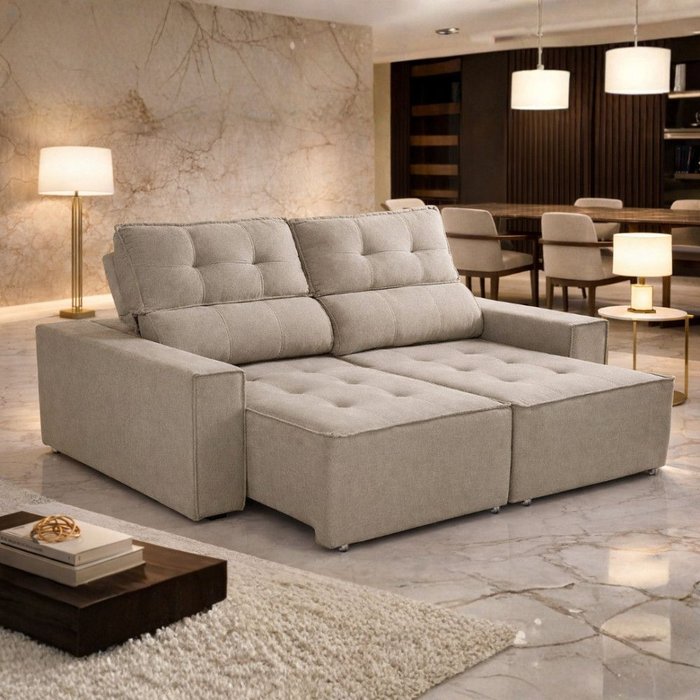 Assento: Retrátil, ideal para transformar o sofá em um verdadeiro espaço de descanso.