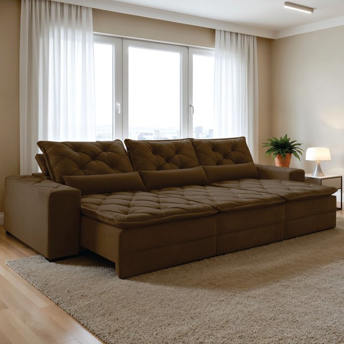 O descanso que você merece está aqui: um sofá retrátil e reclinável em até 5 estágios, pensado para oferecer conforto em qualquer posição. O assento D-28 com molas espirais garante firmeza, durabilidade e aconchego, enquanto os rodízios de silicone facilitam a abertura com leveza. Ele vem acompanhado de 2 rinheiras 100% fibras de silicone, que trazem maciez extra para seus momentos de relax. A base e os pés em madeira maciça unem resistência e elegância, além de serem ecologicamente corretos. E por ser em módulos com engate união, a montagem é rápida e prática, adaptando-se facilmente ao seu espaço. Um sofá completo para transformar sua sala em puro bem-estar. O que significa o sofá ter 5 estágios de reclínio? Permite ajustar o encosto em até 5 posições, garantindo mais conforto.