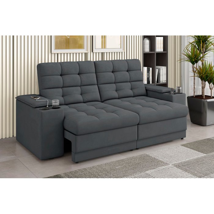 Sofá Retrátil e Reclinável 205cm 3 Lugares com USB e Porta Copo Kansas Cinza