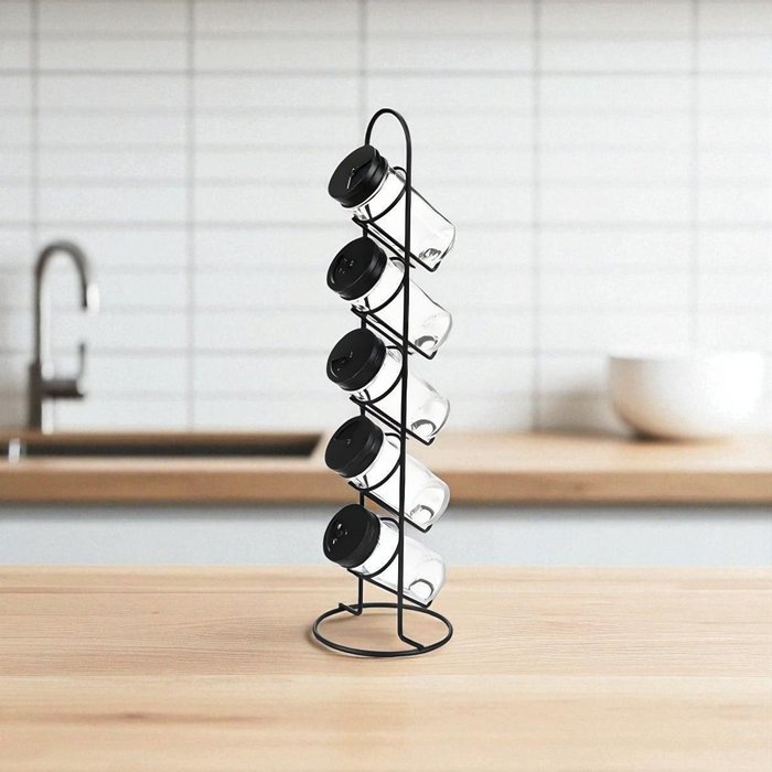 Suporte Organizador Porta Temperos Condimentos 5 Potes de Vidro em Torre Preta