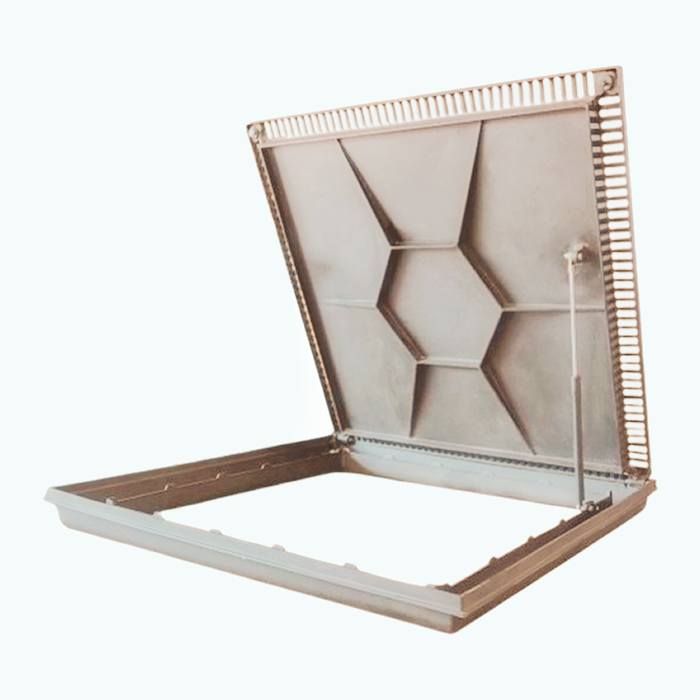 Dimensões: 80x80 cm Material: Alumínio fundido Acabamento: Pintura eletrostática (diversas cores) Modelo: Articulada rebaixada para piso com grelha Marca: Nossa Kasa
