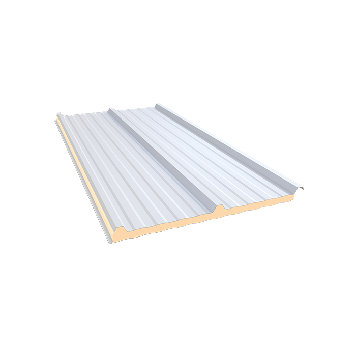 A camada externa é em aço Galvalume com pintura branca; a intermediária, em espuma rígida de PIR de 20 mm; e a interna, em aço pintado na cor branca, que atua como acabamento inferior e pode dispensar o uso de forro tradicional.