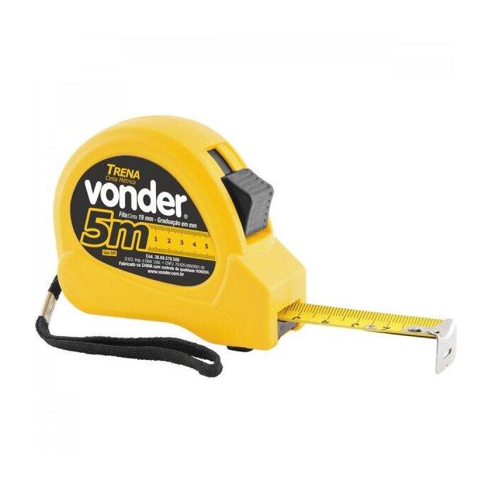 | Informações Complementares | Comprimento da trena: 5 m | Largura da fita da trena: 19,0 mm | Revestimento da fita da trena: Pintado | Acabamento da fita da trena: Pintura fosca antirreflexo | Graduação da trena: mm | Material da caixa da trena: ABS de alta resistência | Sistema de t |
